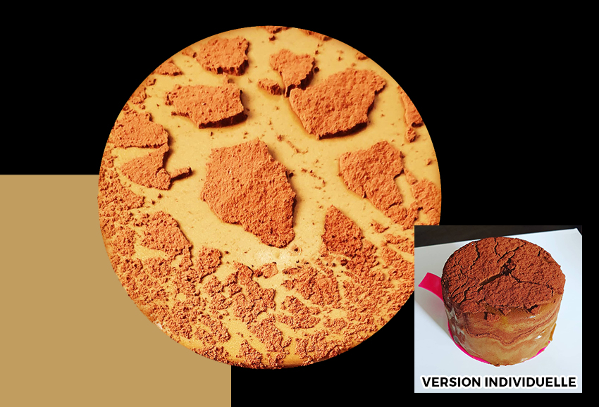 Mousse vanille/tonka, insert caramel beurre salé, biscuits chocolat et croustillant au praliné pécan. D'autres tailles disponibles sur demande