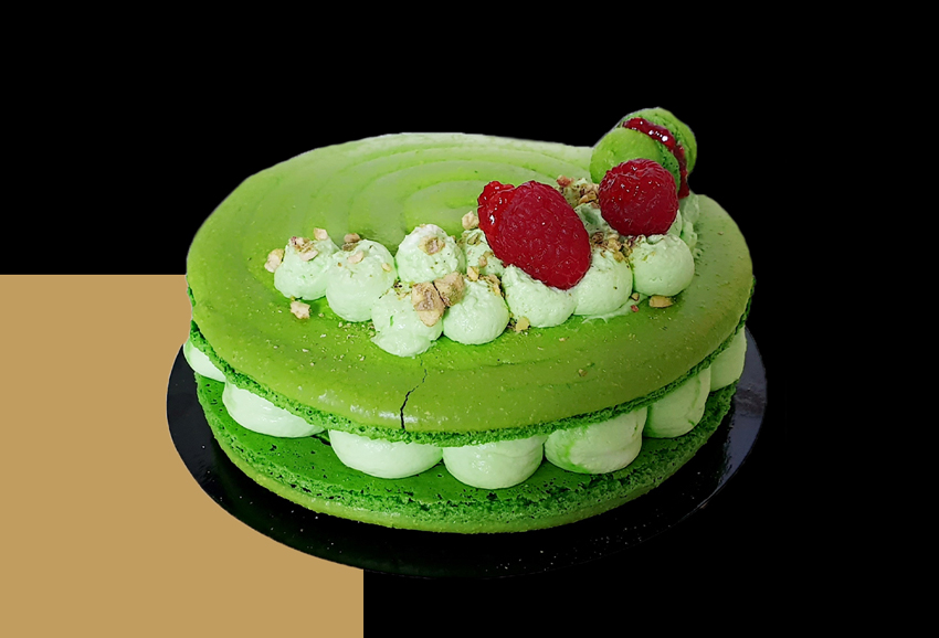 Biscuit macaron à la poudre de pistache, crème au praliné pistache, framboises fraîches et coulis de framboise. D'autres tailles disponibles sur demande